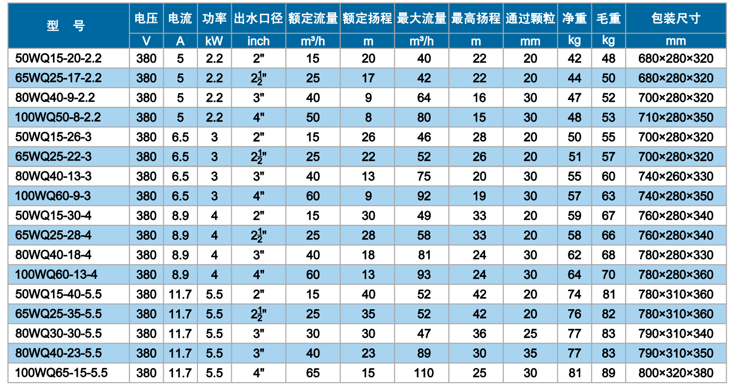 WQ系列双流道潜水排污泵结合了国内外同类优秀产品,经过PCAD软件优化设计而成,在水力模型、结构、密封、冷却和保护控制等方面进行了综合优化和创新设计。叶轮为双流道设计,有较大的进口和出口宽度,无堵塞性能好,高效节能,安全可靠,寿命长。
